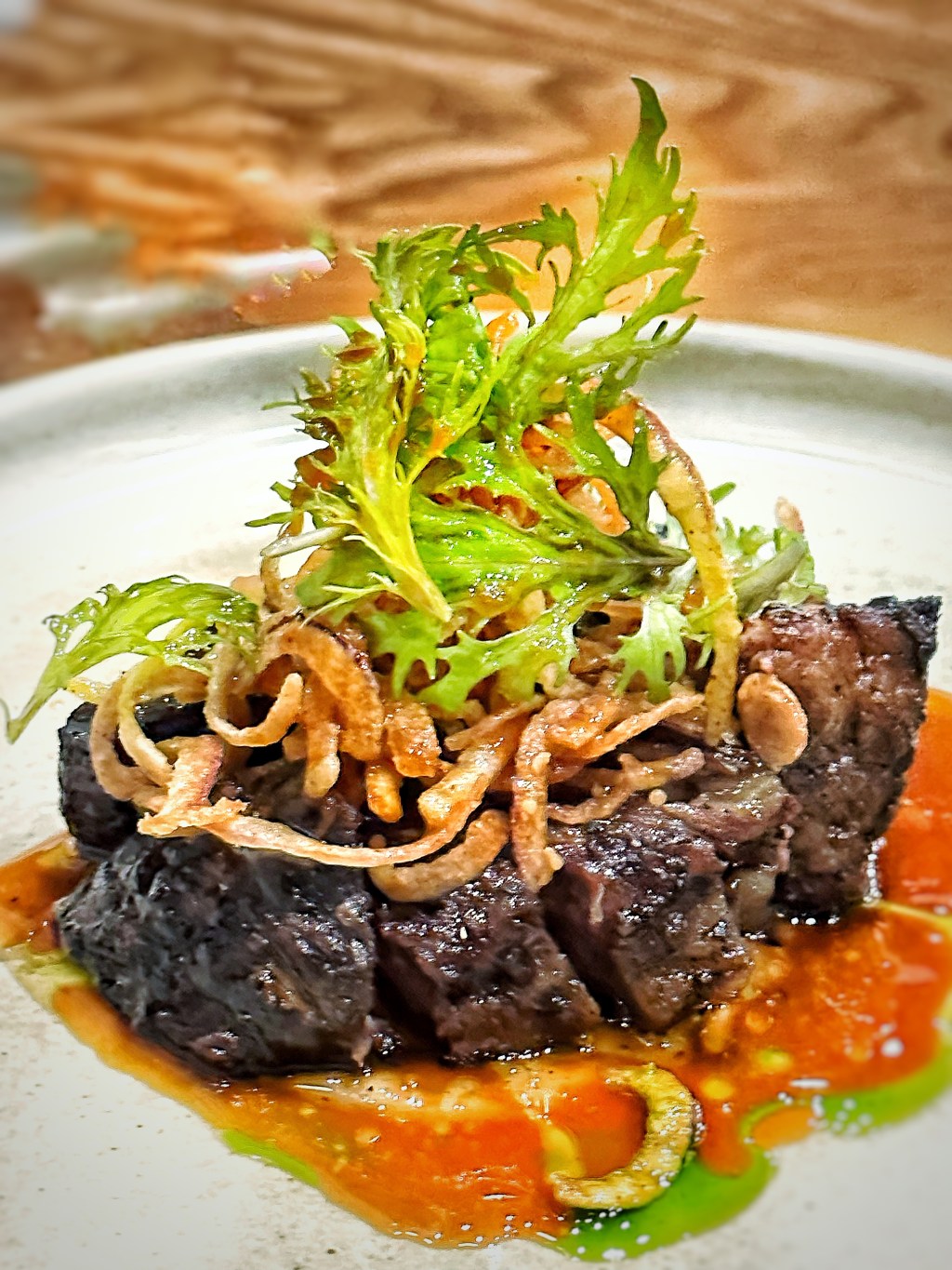 Sous vide for 8 hours then finished on the grill over white onion purée & chive oil. Melt-in-your-mouth texture. Scrumptious! Would have been perfect with rice!
