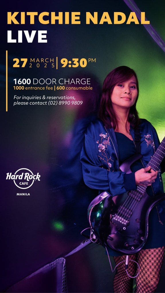 Catch Kitchie Nadal live! on March 27, 2024, at 9:30 PM, at the Hard Rock Cafe Manila in S Maison, Conrad Hotel, Pasay City. Door charge is P1,600 (P1,000 entrance fee; 600 consumable). For inquiries & reservations, contact (02) 8990-9809 or +63 917-144-9400. Limited seats available!
