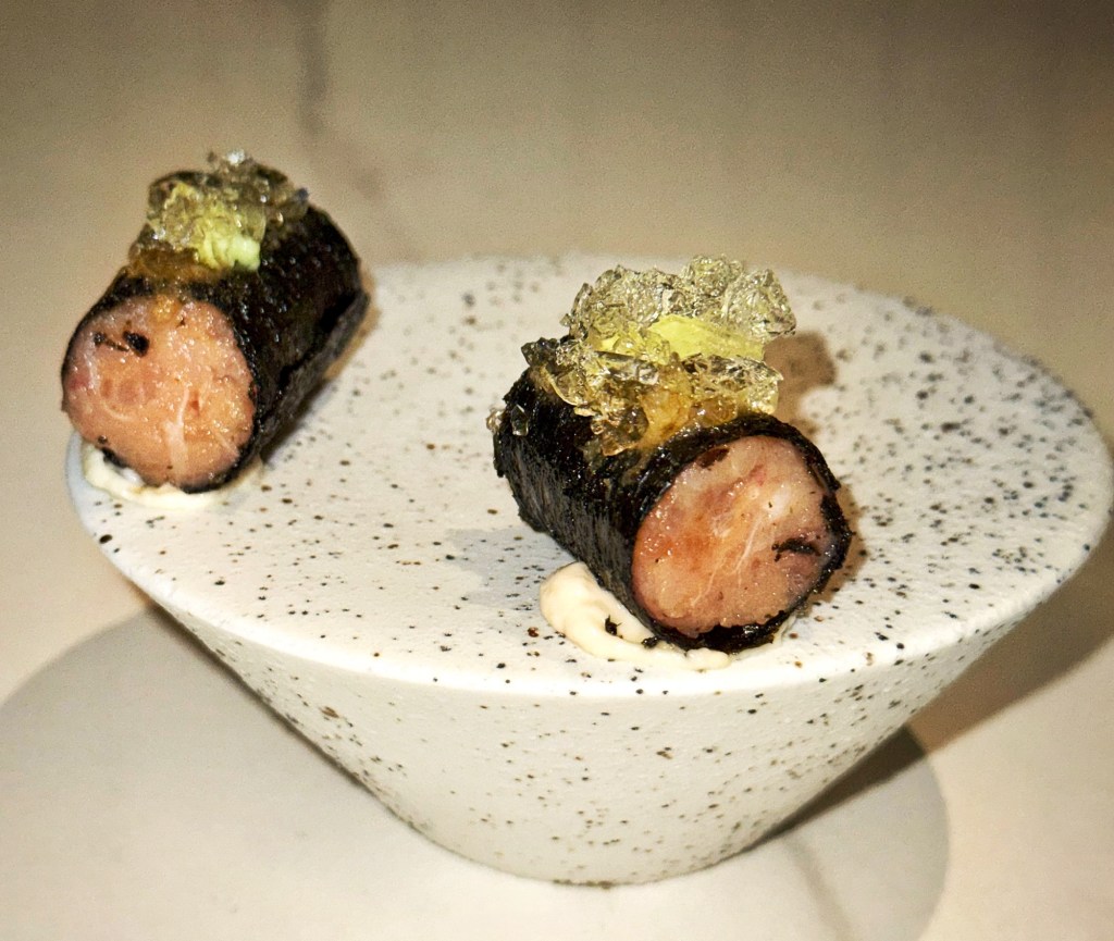 Chef Josh shared that the hamachi, flown in fresh from Japan, was lightly cured and transformed into a tartare, then encased in a crisp shell made from nori seaweed. On top, a touch of ginger gel and freshly grated wasabi root added brightness and heat, while a kelp jelly gently draped over the piece introduced an extra layer of umami depth.