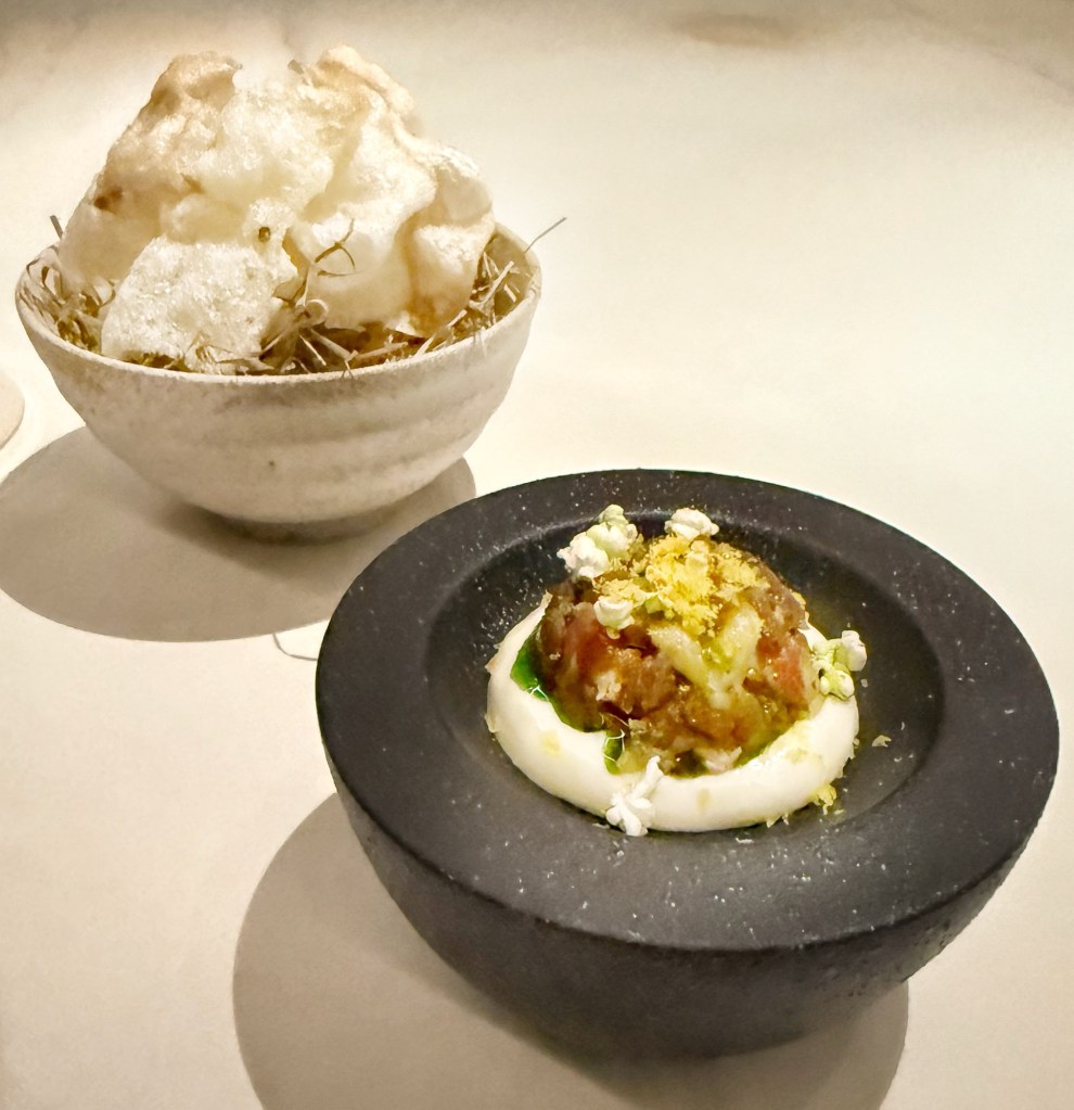 Snack number three was a brilliant play on texture and indulgence and a delightful Pinoy twist to the classic favorite , beef tartare with that crispy tendon chicharrón