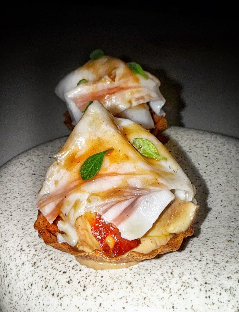 Topping it all was a sliver of cured pork back fat (lardo), glazed in adobo sauce — a clever Filipino touch that added sweetness, salt, and just a hint of nostalgia. A drizzle of oregano oil and a few fresh oregano leaves completed the bite, lending a subtle smokiness and a refreshing herbal note to cut through the decadence.