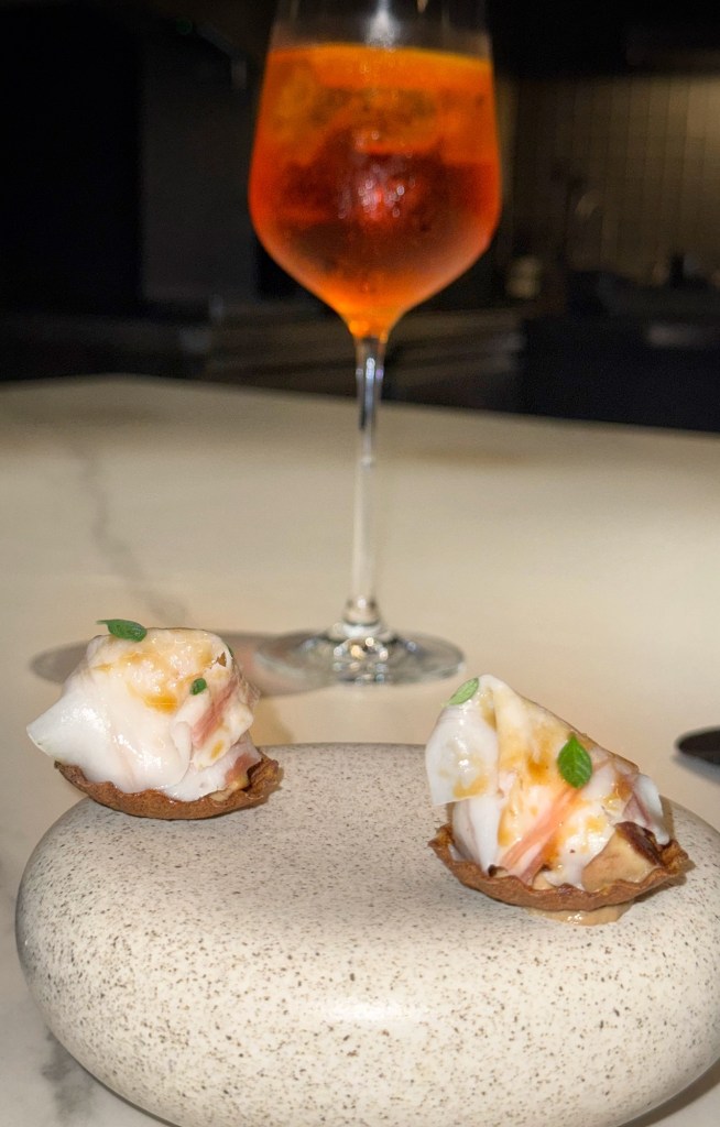 The handsome hubby and I were seated right at the kitchen counter, the best seats in the house if you love watching artistry in motion. Within minutes, our drinks arrived — a crisp martini for him, a bright Aperol Spritz for me — and just like that, the stage was set.