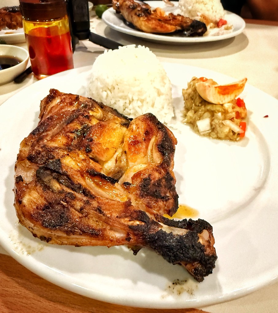 At 11:45, our chicken inasal finally emerged from the kitchen, trailing warm, smoky perfume like a promise fulfilled. The chicken was plump and glistening, its skin catching the light with the sheen of careful grilling. It was served simply—plain steamed rice alongside a humble salad of mashed boiled eggplant, tomato, garlic, and salted egg. On the table waited the familiar companions: soy sauce, vinegar, and the fiery red siling labuyo.