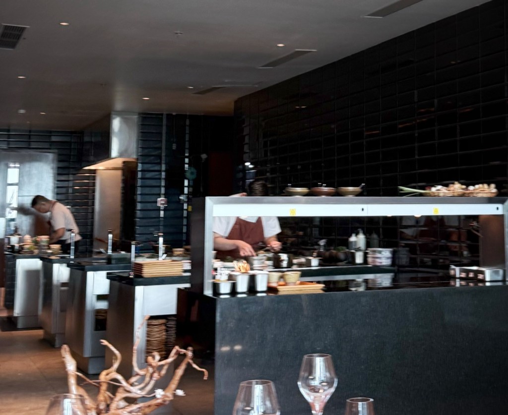 On the left side is a galley-style kitchen composed of five counters, where the chefs work in full view, their choreography as much a part of dinner as the dishes themselves.