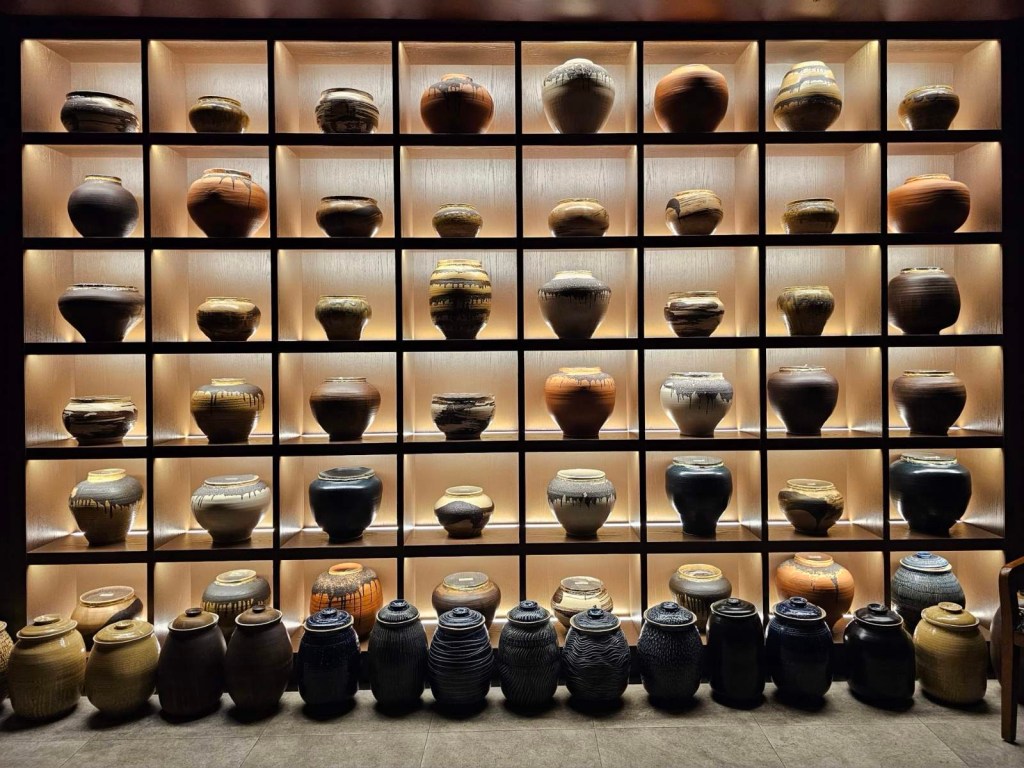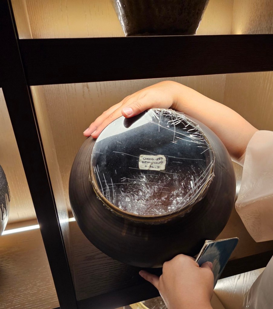 Stepping inside, we were immediately drawn to a striking feature: a fermentation wall lined with 48 jars of miso, their hues ranging from pale gold to amber to deep azure. The oldest, we were told, dates back to 2021.