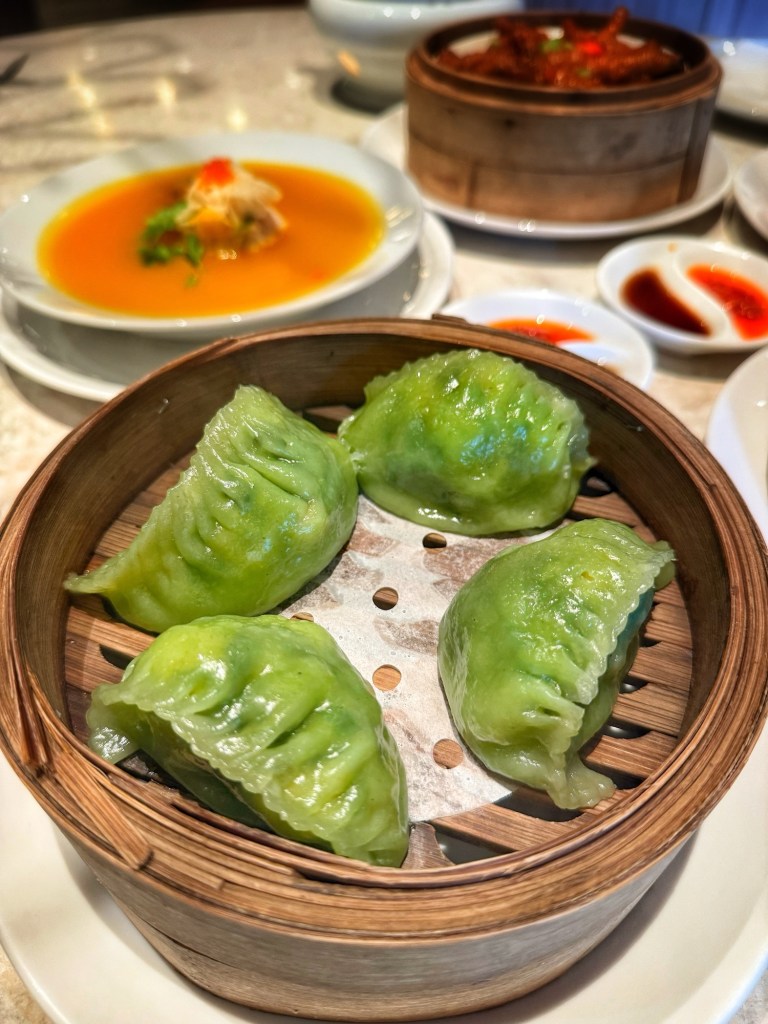 The folds are tidy and precise, almost showcasing the kitchen’s quiet confidence. The wrapper hits that sweet spot between thin and sturdy, allowing the shrimp filling to shine without feeling weighed down. And that vibrant green hue? It lifts the entire plate visually, making the dumplings look as fresh as they taste.