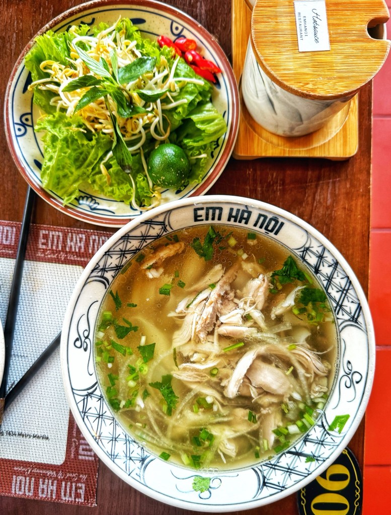 A warm bowl of pho ga lands on the table, comforting and fragrant.