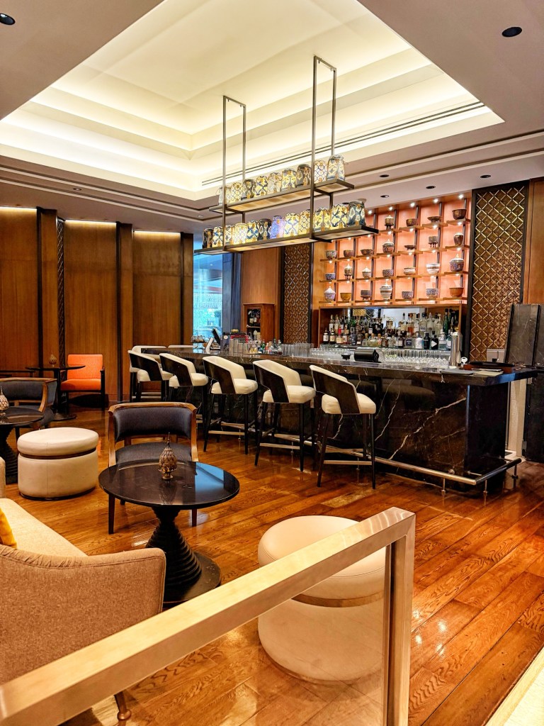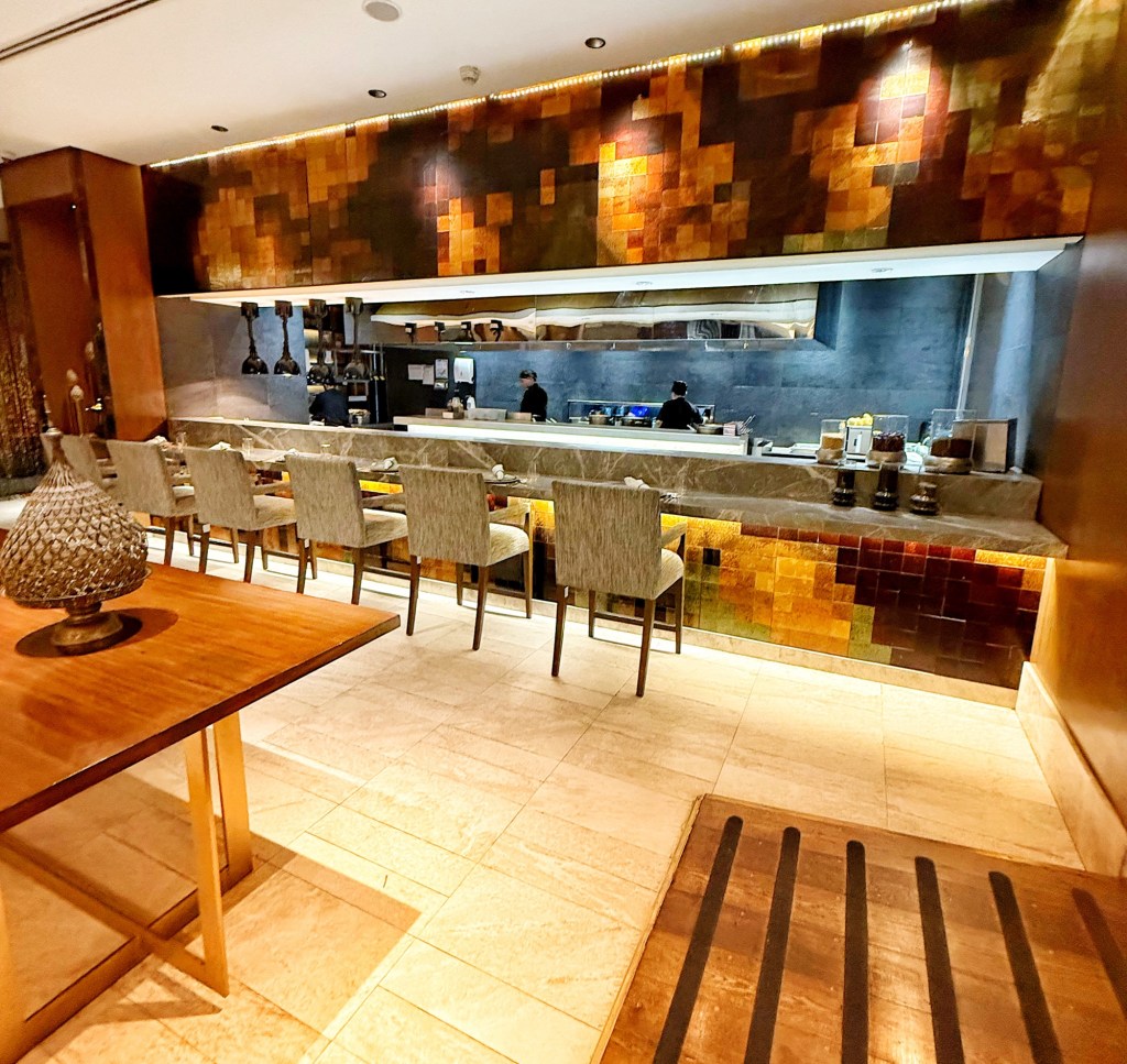 We settled in for lunch beneath lofty ceilings, surrounded by a kind of elegance that doesn’t press down on you. The room is expansive, opulent but unshowy, confident in its sense of space. There’s an option to sit at the kitchen counter, close enough to watch the choreography of fire, hands, and quiet precision. We didn’t choose it. We regret that now.