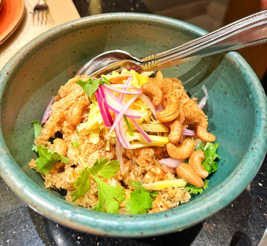 We began with the catfish salad—bright, sharp, and bracing. A proper awakening. Then came the dish that had been living rent-free in my husband’s memory: the 72-hour green beef curry, silky and slow-cooked into tenderness.