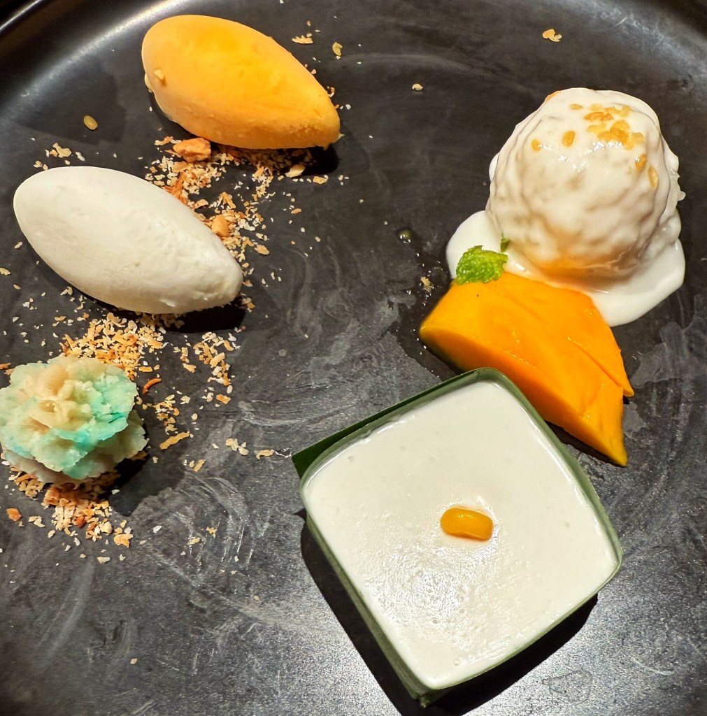 Dessert, however, was inevitable. Mango sticky rice, mango ice cream, kanom taco a Thai dessert crowned with coconut cream and corn—comforting, nostalgic, quietly indulgent.