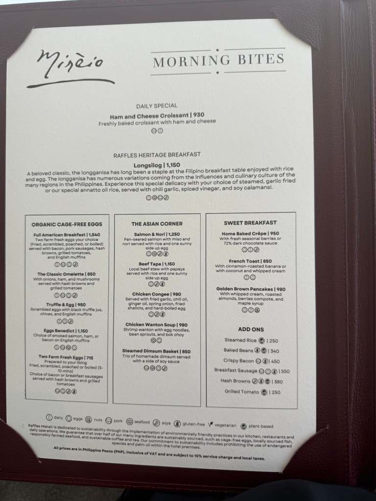 Months after our first morning here, the format remains thoughtfully unchanged. Guests may choose the cold buffet, a composed spread of fresh fruits, artisanal breads, coffee, and made-to-order fresh juices, priced at ₱1,250. For a more expansive indulgence, the Ultimate Breakfast builds upon the cold buffet with à la carte hot dishes from the menu, accompanied by unlimited specialty coffee, hot chocolate, and wellness-focused fruit beverages, offered at ₱2,500.