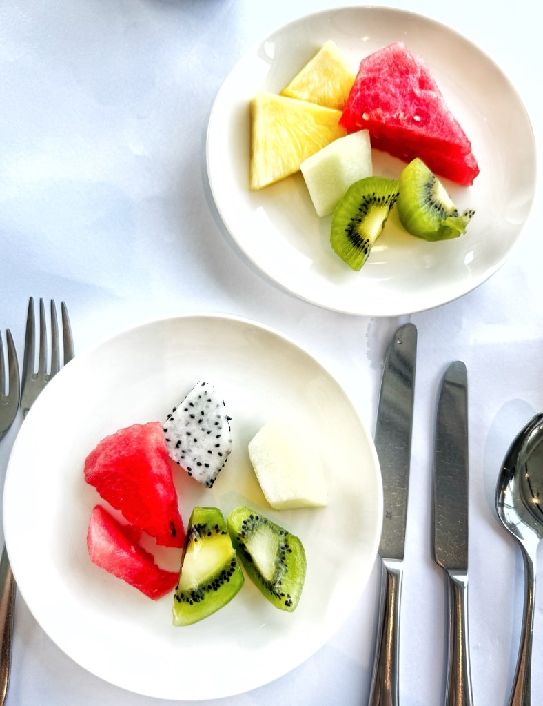 I began with two glasses of freshly squeezed orange juice, followed by eggs Benedict crowned with smoked salmon. From the cold buffet, I selected slices of watermelon, green melon, and dragon fruit—clean, refreshing interludes between courses.