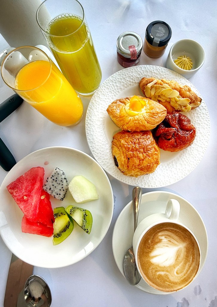 My husband, on the other hand, remained loyal to the cold buffet, where he explored a well-curated selection of freshly baked breads, from classic croissants to indulgent kouign-amann, all enjoyed with unlimited hot lattes and, later, a freshly squeezed juice of his choosing.