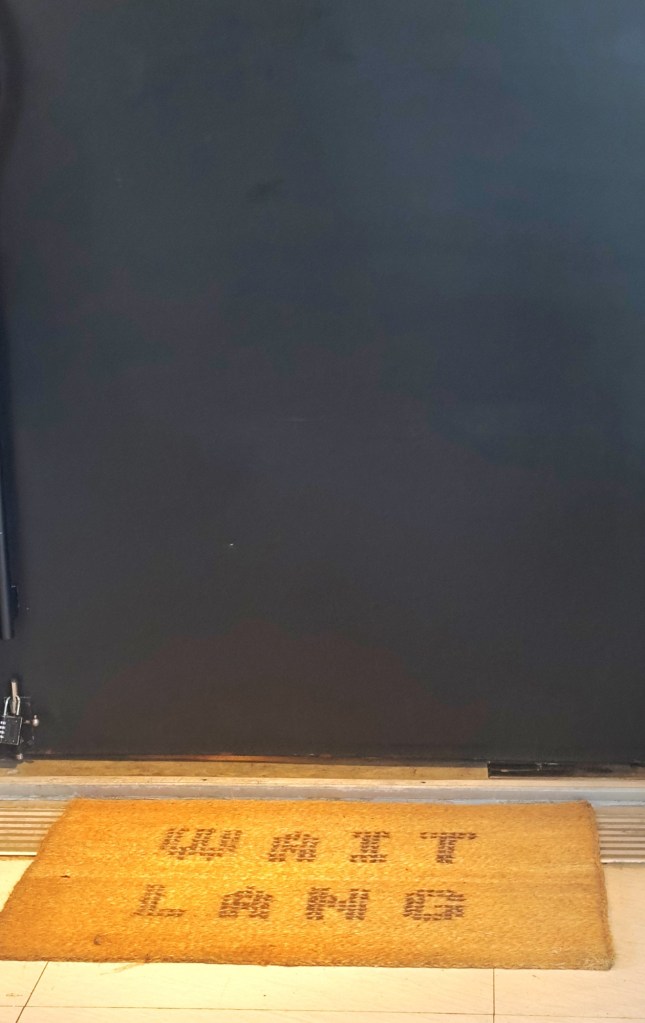 Before us stood an imposing grey-black door, deliberately austere in its anonymity. At its threshold lay a doormat bearing the legend , “wait lang.”