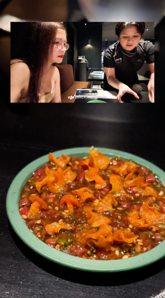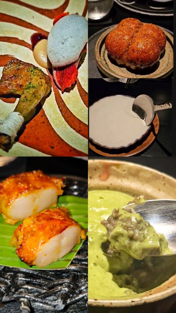 The bread course arrived as a moment of pause. Coconut sugar milk bread, softly sweet and pillowy, was paired with aged kesong puti. The instruction was simple and almost ceremonial: tear, dip, repeat. The gentle sweetness of the bread against the tangy, umami depth of the aged cheese grounded the meal, reminding us that restraint can be just as memorable as flourish.