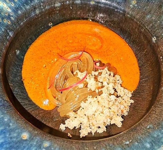 The plate was cooled by an amazake granita, made from amazake, a traditional Japanese fermented rice drink known for its natural sweetness and low alcohol content. Frozen into delicate crystals, it offered a clean, mildly sweet contrast, refreshing the palate as it melted.