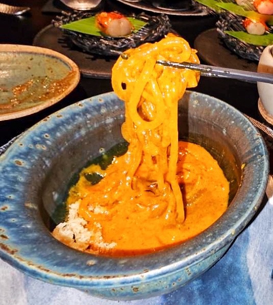 The menu then shifted gears. A barbecued Maine lobster tail emerged, its flesh luscious and lightly kissed with smoke, accompanied by smoked fish head noodles that delivered a deeper, more assertive savoriness.