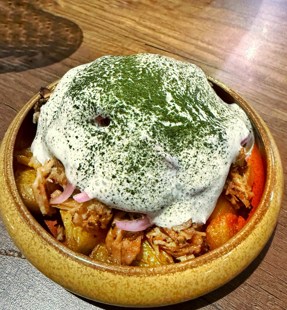 Thrice-cooked potatoes, pork hamonado flakes, mushroom aioli, burnt nori