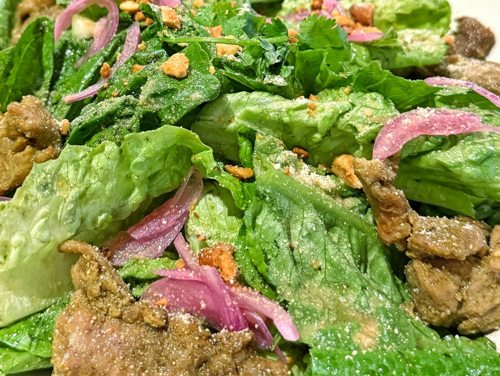 I needed something green, so this felt like the sensible choice. The greens arrived fresh and crisp, providing a clean, refreshing base. The black vinegar pesto leaned a little sweet, wishing for a brighter jolt of acidity to sharpen the overall profile. The satay-grilled chicken was aromatic but edged toward chewy. All told, it was a pleasant, comforting opener, perfectly fine, though one that could benefit from tighter balance and a bit more lift.