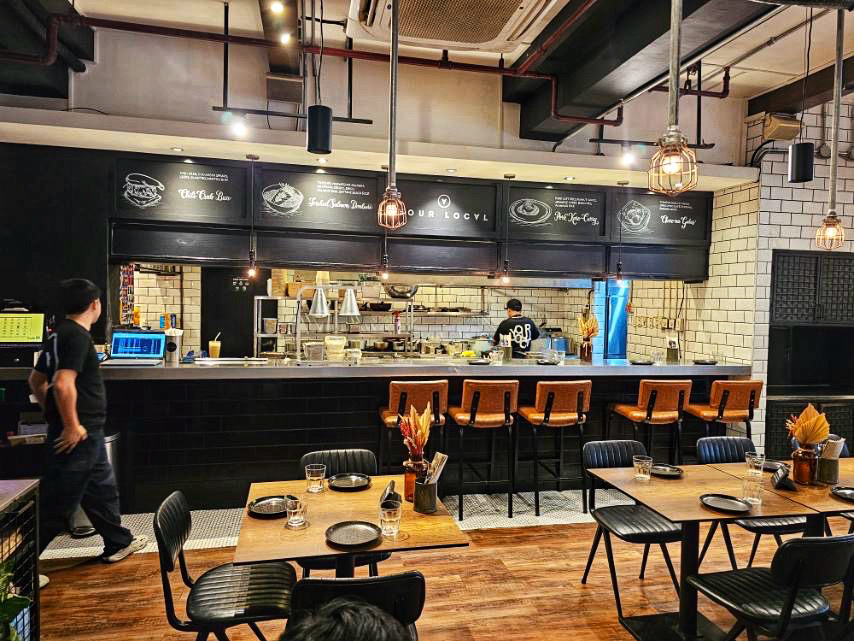 Wooden tables, black chairs, and what appears to be a hulking stainless-steel industrial freezer stamped with the Your Local logo complete the theme, reinforcing an industrial aesthetic that feels clean, unfussy, and confidently modern.