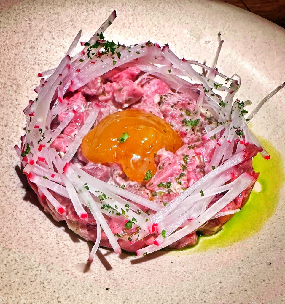 Beef Tartare, marinated egg yolk, radish pesto 595