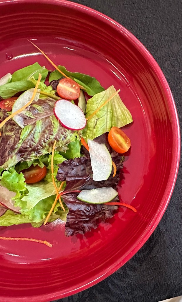 It begins with Soup of the Day, followed by assorted garden greens with honey mustard dressing.