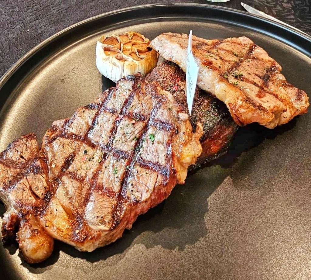 Then the steaks arrive : the opening salvo. Rib eye, wagyu hanger, and striploin, each cooked to a perfect medium rare, their juices glistening beneath the dining room lights.